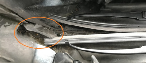 Ein weiterer Nachteil der Zubehör-Wischer (mit 560 mm Länge) ist, dass sie in Ruhestellung häufig über die "Wischerbremse" hinausschlagen (siehe Bild). Das liegt daran, dass die "Einhang-Achse" des Zubehör-Wischers mittig platziert ist (bei 280 mm) und nicht asymmetrisch (300 zu 260 mm), wie es bei originalen oder Bosch 014 Wischern der Fall ist.