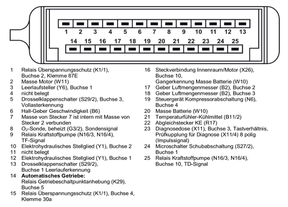 Achtung! Es gibt unterschiedliche Steuergeräte, daher zeigt diese Tabelle keine Pinbelegung auf! Bitte anhand der Bildbeschreibung vorgehen. Es werden nur Geberdaten beschrieben, also die Daten, die dem Steuergerät zur Verfügung gestellt werden, Daten die das Steuergerät ausgibt sind nicht gelistet. Ein Beispiel: Das ÜSR ist ein Geber und gelistet, das EHS ist ein Empfänger und wird nicht gelistet, weil an dieser Stelle nicht messbar.