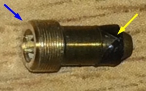* Mit einem (Digital-) Meßschieber messen, wie weit die Madenschraube im Gehäuse steckt (gemessen wird auf dem Kopf der Schraube, nicht in der Vertiefung für den Inbus). | * Mit einem (Digital-) Meßschieber messen, wie weit die Madenschraube im Gehäuse steckt (gemessen wird auf dem Kopf der Schraube, nicht in der Vertiefung für den Inbus). | ||