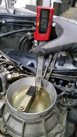 - Nun die Messung exakt wie vorher wiederholen, dabei die Stauscheibe vorsichtig herunterdrücken, bis der Leerweg zu Ende ist und Widerstand spürbar wird. Das Ergebnis sollte nun 1,2 mm bis 1,5 mm mehr sein.