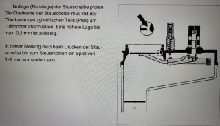 - Die Stauscheibe hat also einen gewissen Leerweg; dieser soll zwischen 1 mm und 3 mm liegen, im Idealfall eben bei 1,9 mm; allerdings am Außenrand des Ansaugtrichters gemessen! Eine "einfache" Messung am Außenrand des Trichters ist (durch die Schräge) schwierig, von daher machen wir unsere Messung vom Mittelsteg in der Mitte herunter. Der Radiuspunkt, auf dem wir hier auf der Stauscheibe treffen, ist entsprechend weiter innen, folglich messen wir hier nicht 1,9 mm, sondern etwa die bereits erwähnten 1,2 mm bis 1,5 mm.