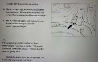 - Wird dieser wert nicht erreicht (oder überschritten), EHS abbauen und an der Madenstellschraube nachjustieren. Achtung! Bevor Änderungen an der Madenstellschraube vorgenommen werden, die Einschraubtiefe (als Anhaltspunkt) ermitteln; kommt man nicht zum Erfolg, so hat man wenigstens die Möglichkeit alles wieder auf "Ursprung" zurück zu versetzen. Bei nicht erreicht in Richtung Fett (ist meistens der Fall), bei überschritten in Richtung Mager. Beim Einstellen unbedingt der Differenzdruck im Auge behalten, er soll bei 0,4 Bar liegen. Häufig hat ein Verstellen in Richtung Fett sich bewährt, wir reden dann aber über einen Differenzdruck von maximal 0,45 Bar (häufig reichen bereits Werte von 0,42 Bar). Übersteigt man den Wert von 0,45 Bar, ist es in der Regel nicht mehr möglich den Leerweg von max. 3 mm an der Stauscheibe einzuhalten (geschweige den Idealwert von 1,9 mm), das System gerät dann aus dem Gleichgewicht, ist also nicht empfehlenswert.