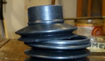 - Die Manschette kann man aus dem Faltenbalg F 3061 NBR machen, dazu trennt man ihn an der zweiten Falte von oben auf (scharfe Cutterklinge) und erhält so eine niedrige Manschette, die unten unter den Ring geklemmt wird und oben in die Nut vom Kugelbolzen eingreift. Die unterste Falte mit einer scharfen Schere soweit stutzen, bis der Durchmesser zum Ring passt, der Hals oben wird an dem kleinen Wulst abgeschnitten.