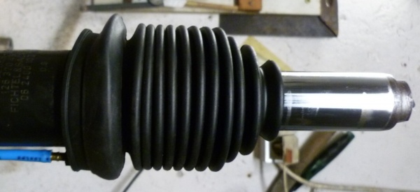 - Zum Tausch der Bälge und Manschetten die Kugelgelenke von der Kolbenstange abschrauben. 2x Gabelschlüssel SW22 wird benötigt, einen davon muss man auf 5 mm dünn schleifen. Alternativ die Kolbenstange (in Alubacken !!!) in einen kräftigen Schraubstock einspannen.