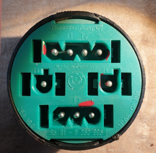 Als Lautgeber dient dazu ein Gong aus dem Autofabrikat eines ehemaligen Flugmotorherstellers (BMW). Er hat eine Tonnenform mit etwa 5 cm Höhe und etwa 5 cm Durchmesser. Auf der Rückseite zeigt er drei Anschlußreihen. Jeweils in der oberen und unteren Reihe sind rechts die Plus- und links die Minus-Anschlüsse zu sehen; die Klangkontakte sind mit T1...T5 gekennzeichnet. Schön: Die mercedestypischen 2,5mm-Hülsen passen auf die Steckerpins des Gongs.