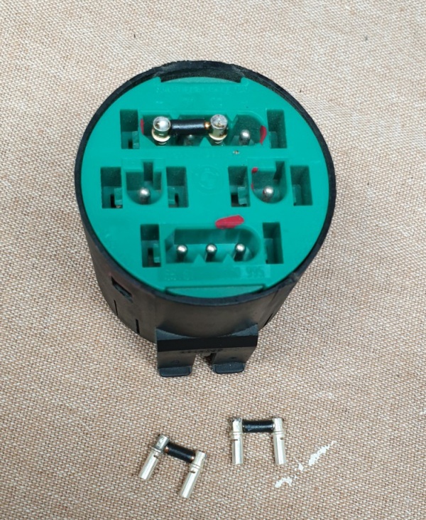 5 Klangvariationen können durch einfaches Umsetzen von Steckverbindungen gewählt werden. Dazu wird der gewünschte Klang-Kontakt mit dem ungenutzten Minus-Kontakt verbunden. Eine solche Brücke kann starr oder flexibel ausgeführt sein. Hier ist die Löthilfe mit den Hülsen dargestellt; im Vordergrund weitere Hülsen.