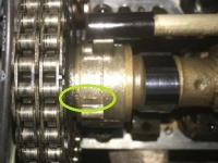 Tatsächlich gemessen wurde an der Kurbelwelle 29° nach oT (s. Foto), das ergibt also eine Differenz von 8° auf der Kurbelwelle zum Sollwert von 21°. Diese 8° KW-Abweichung kann nun, nach einem Blick in die Tabelle, durch Einsetzen der Scheibenfeder (A 621 991 01 67) ausgeglichen werden. Die Steuerkette muß nicht gewechselt werden, das Tauschen der Scheibenfedern reicht!