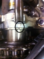 Um einen möglichen unterschiedlichen Versatz der beiden Nockenwellen feststellen zu können, die Messung wie folgt vornehmen: Motor von Hand im Uhrzeigersinn so durchdrehen, daß der Zeiger an der Schwungscheibe der Kurbelwelle auf die "0" zeigt und der Verteilerfinger des Zündverteilers (Kappe abnehmen) auf den ersten Zylinder zeigt. Nun die Markierungen der beiden Nockenwellen auf Flucht prüfen, ist die Markierungsdifferenz unterschiedlich, kann man davon ausgehen, daß auch unterschiedlichen Scheibenfedern eingesetzt werden müssen. Ist bei dieser Meßmethode nur die rechte Bank aus der Norm (geringer Versatz), muß in der Regel auch nur die rechte Seite korrigiert werden.