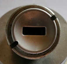 - Je nachdem, wie die Schraubkappe verdreht ist (sie kann etwas Spiel rund um den Sicherungsbolzen aufweisen), kann die Stellung zur Einführung des Drahtes etwas vor oder hinter der "I" liegen. Anhand eines vorliegenden Neuteils und der Stellung des Schlüssel-Schlitzes kann man sich gut vor Augen führen, in welcher Position sich der Sicherungsbolzen gerade befinden müsste.